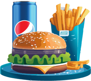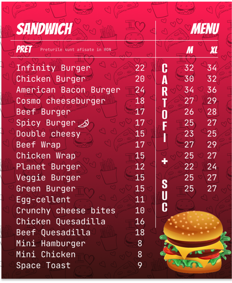Chifla cu susan, 2 bucati branza cheddar, 2 bucati carne vita, castraveti murati, sos cheddar, ceapa rosie, cartofi prajiti M/L, doza suc la alegere 330ml